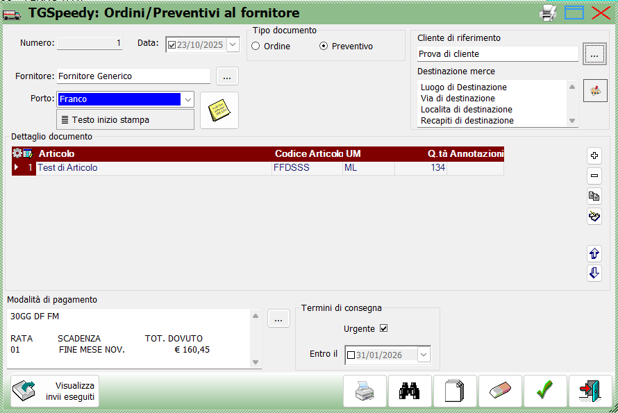 Una volta impostata la parte superiore della maschera sarà possibile compilare le righe con gli articoli desiderati. Se è stato impostato un fornitore gli articoli selezionabili saranno solo quelli abbinati al fornitore indicato. Se si desidera essere liberi di ordinare da un determinato fornitore articoli ad esse non abbinati, sarà sufficiente compilare prima le righe ed in ultimo indicare il fornitore nel campo corrispondente in alto a sinistra della maschera.
