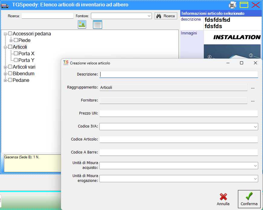 Ad ogni modo, nella maschera di ricerca degli articoli in basso a destra comparirà un pulsante con un foglietto bianco. Facendo click su tale pulsante si aprirà la maschera mostrata in figura per un inserimento rapido dell'articolo. Prima di procedere con la creazione è necessario che sulla maschera di ricerca si faccia click su di un raggruppamento, in modo da creare il nuovo articolo all'interno del raggruppamento selezionato. Nell'esempio mostrato in figura il raggruppamento scelto è descritto come "Articoli".
